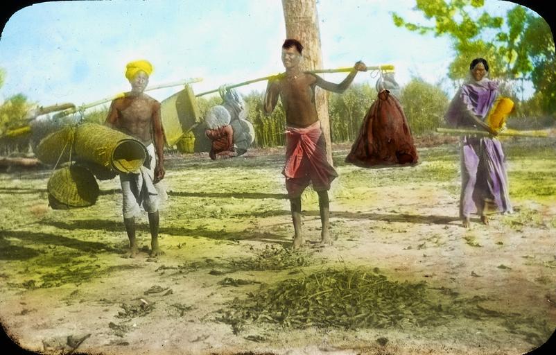 | Keywords: Gipseys (sic.) with the day's plunder, Gopalganj, India, ca. 1915 (IMP-CSCNWW33-OS14-45).jpg en <br> Gipseys sic with the day's plunder Gopalganj India ca 1915 Tinted lantern slide featuring two men and one woman One older and one young man carry bags and fabric on shoulder poles A woman walks further behind carrying other items The original caption to this slide reads Gipseys sic illegible with the day's plunder Gopalganj This slide comes from a collection created by missionaries from Regions Beyond Missionary Union an interdenominational Protestant evangelical mission working in northeast India Bihar and Orissa and Nepal Photographer Unknown Filename IMP-CSCNWW33-OS14-45 tif Coverage date 1910/1920 Subject unesco Ethnic groups; Indigenous people Part of collection International Mission Photography Archive ca 1860-ca 1960 Part of subcollection Photographs from the Centre for the Study of World Christianity University of Edinburgh U K ca 1900-ca 1940s Repository name Centre for the Study of World Christianity Archival file Volume3/IMP-CSCNWW33-OS14-45 tif Repository address The University of Edinburgh School of Divinity New College Mound Place Edinburgh EH1 2LX United Kingdom Geographic subject country India Format aacr2 lantern slides 8 2 x 8 2cm Geographic subject continent Asia Rights Contact the repository for details Part of series Regions Beyond Missionary Union India captioned lantern slides CSCNWW33/OS14 Repository email divinity-CSWC ed ac uk Date created 1910/1920 Publisher of the digital version University of Southern California Libraries Subject aat genre group portraits Format aat lantern slides; photographs Geographic subject state Bihar Access conditions http //www ed ac uk/schools-departments/divinity/research/centres/world-christianity/collections-resources Geographic subject plains File CSCNWW33/OS14/45 Subject lcsh Romanies; Women; Men 1910/1920 date created author http //digitallibrary usc edu/cdm/ref/collection/p15799coll123/id/78261 PD-old-70-1923 Magic lantern images Images from USC Digital Library uploaded by Fæ International Mission Photography Archive ca 1860-ca 1960 Gopalganj District Transport in Bangladesh People of Bangladesh |