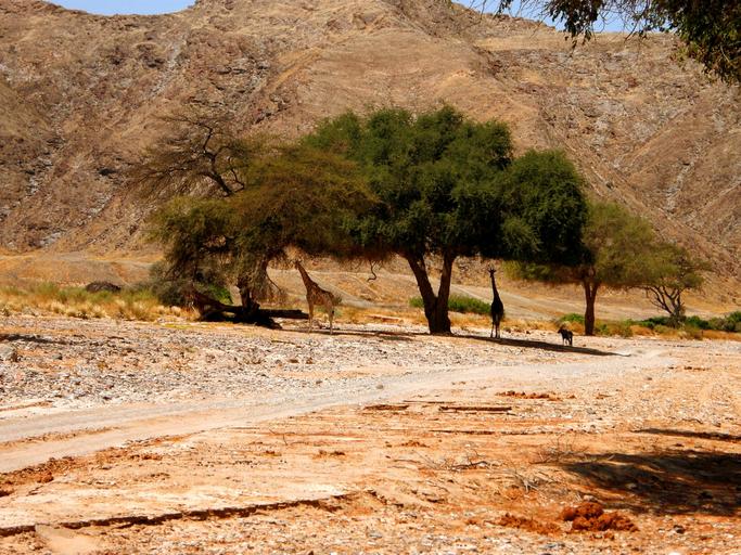 Keywords: giraffe mammal tree thorns sun shade shelter desert sand