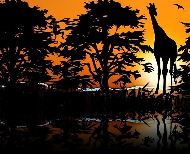 Keywords: giraffe zoological animals savannah west sunset sol trees african against light reflection lake