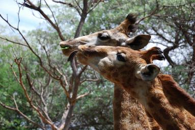 Keywords: giraffes animals heads tall south africa eating mammals brown african wildlife necks long stretching profiles