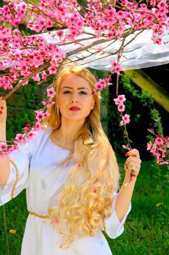 Keywords: girl blond hair princess tree flowers spring story portrait woman beauty