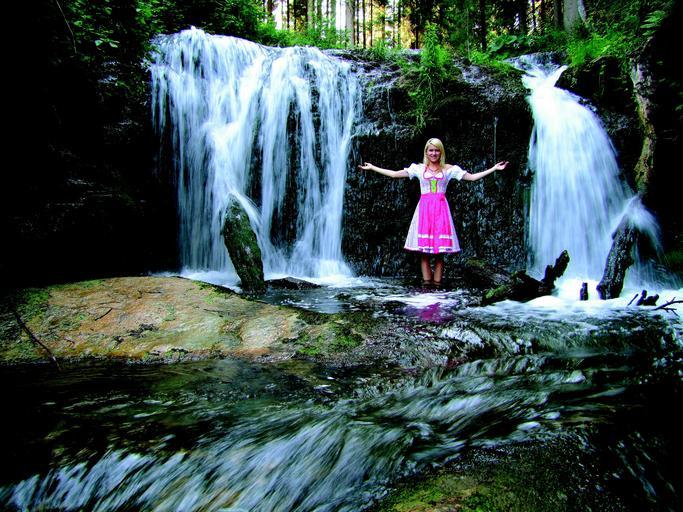 Keywords: girl dirndl maid woman blonde pretty water waterfall austria