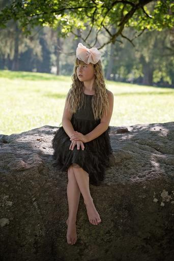 Keywords: girl dress haarschleife out nature summer long hair portrait human black dress barefoot person