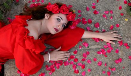 Keywords: girl flowers wreath red roses petals