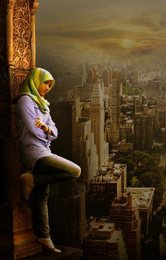 Keywords: girl gorgeous stand up building tower high sunset
