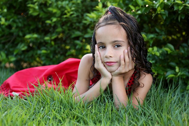 Keywords: girl looking girl in the garden model child family green grass red dress garden hair beauty childhood face photo girl little girl pose linda natural small