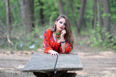 Keywords: girl orange table forest beauty blue eyes loneliness wood