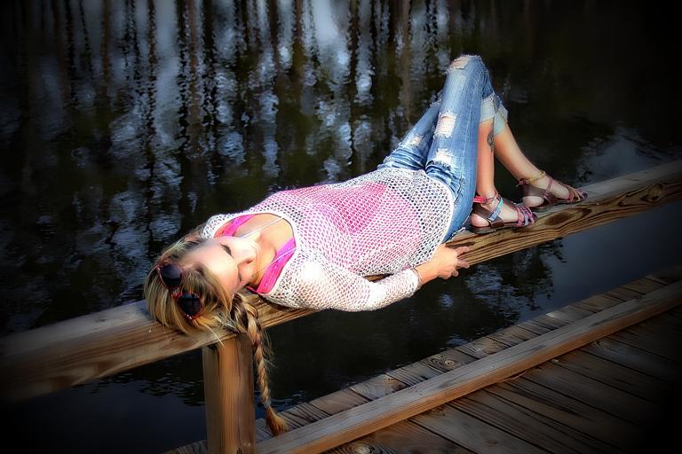 Keywords: girl port portrait laying down outdoors young water pier