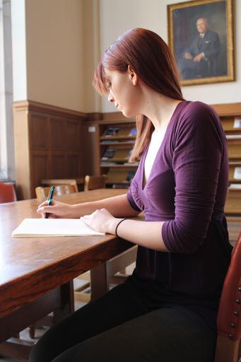 Keywords: girl school university education person student woman hair desk purple table indoors studying concentrate study wooden notebook concentration learn thinking