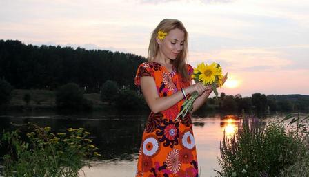 Keywords: girl sunset sunflower lake water reflection blonde beauty in the evening