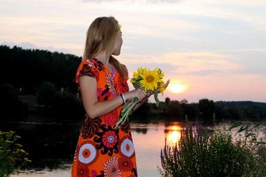 Keywords: girl sunset sunflower lake water reflection blonde beauty in the evening
