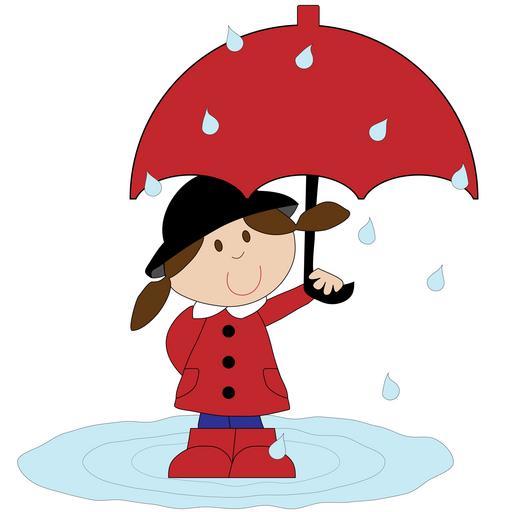 Keywords: girl child little cute red umbrella rain raindrops clip-art illustration puddle