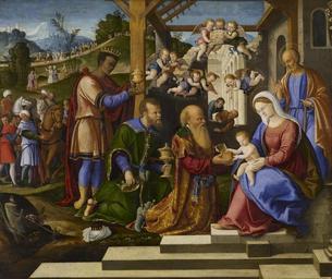 | Keywords: Girolamo da Santacroce - The Adoration of the Three Kings - Walters 37261.jpg Walters Art Museum artwork Q18748566 Creator Girolamo da Santacroce Three wise men or magi from the East are described in the Gospels as having seen a new star and journeyed to pay tribute to the child marked as divine by the heavens The wise men were often depicted as kings and by the Renaissance the youngest was frequently depicted as an African here holding a gold vessel containing myrrh a precious resin from Arabia and Africa used for perfume His portrayal reflects both the ethnic diversity encountered by Renaissance painters in a port like Venice frequented by African traders and also the concept of Christ's promise of salvation for all people The splendor of the kings contrasts with the simplicity of the Holy Family Chubby little angels sing the words inscribed on the scroll Glory to God in Heaven and Peace to Men on Earth accompanied by others playing flutes and a violin Zeri Italian paintings in the Walters Art Gallery 276 403-404 ca 1525 1530 Renaissance oil on panel Painted surface incl strip at bottom; d is excl cradle cm 67 7 81 2 0 8 with frame cm 92 08 105 41 6 99 accession number 37 261 12854 Pinacoteca Manfrin Venice prior to September 1872 cat no 51 Don Marcello Massarenti Collection Rome date and mode of acquisition unknown Henry Walters Baltimore Walters Art Museum Henry Walters Acquired by Henry Walters with the Massarenti Collection 1902 GLORIA IN \ ALTISIMI \ DEO \ ET IN TERA \ PASE FRAGIL \ OMENI Glory to God in Heaven and Peace to Men on Earth place of origin Venice Italy Walters Art Museum license 2D Italian Renaissance paintings in the Walters Art Museum Girolamo da Santacroce Media contributed by the Walters Art Museum needs category review |