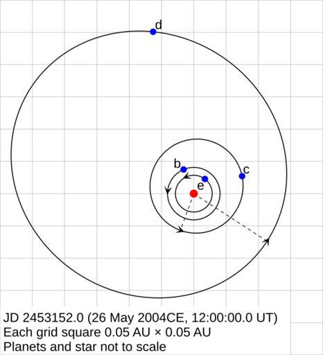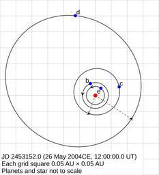 Keywords: GJ581orbits.svg validSVG element in the SVG's source code gives further information <b>Assumptions </b> It is assumed that the system is coplanar This cannot be constrained by the radial velocity observations used to detect the planets in this system but our solar system's planets are nearly coplanar and both the systems of PSR B1257+12 planets B and C and Epsilon Eridani planet b and the circumstellar disk are coplanar see http //adsabs harvard edu/abs/2003ApJ 591L 147K Konacki and Wolszczan 2003 The Astrophysical Journal 591 L147 “L150 Masses and Orbital Inclinations of Planets in the PSR B1257+12 System and http //adsabs harvard edu/abs/2006AJ 132 2206B Beust et al 2006 The Astrophysical Journal 132 2206 “2218 The Extrasolar Planet É› Eridani b Orbit and Mass respectively so this assumption is at least reasonable The direction of rotation around the star is assumed to be the same for each planet Again this cannot be constrained by the current radial velocity observations but is a reasonable assumption since this is true for the major planets in our own solar system and is predicted by current theories of planet formation Under these first two assumptions the orientation of the orbits relative to each other is correct as depicted in this diagram however their actual orientation in 3D space with respect to external reference points e g the Sun the galactic centre is unknown hence such directions are not indicated on the diagram A further assumption is that the true masses of the planets are small compared to that of the star If the masses were comparable to that of the star the actual semimajor axis corresponding to the measured orbital period would be greater This assumption is supported both by probability the chance that we are observing a system which has sufficiently low inclination for this to be relevant is very low and by dynamical stability arguments which indicate that the planets cannot have true masses much more than 1 6 times their minimum masses Mayor et al 2009 This effect can therefore safely be neglected <b>Interpreting the diagram</b> The planetary orbits are drawn in orthographic projection as viewed from directly above the plane of the system so that the orbital direction is anticlockwise The dashed lines are drawn between the star and the periastron point of each planet in order to depict the relative orientation of the orbits with respect to each other The position of each planet in its orbit is calculated using the time of periastron in the table in the Mayor et al 2009 paper and are drawn at a time chosen to be close to the start of the Udry et al 2007 radial velocity observations which are available http //cdsarc u-strasbg fr/ftp/cats/J/A+A/469/L43/gl581 dat here This time is chosen to minimise the effects of both uncertainties in the orbital parameters and potential orbital evolution of the system While the orbits are drawn to the correct scale the star and the planets themselves are not shown to scale as they would be too small to see on the scale of this diagram In addition the true radii of the planets themselves are currently unknown as no direct observation of the planets has yet been made own Icalanise 2008-10-05 <gallery> File GJ581orbits Vogt2010 svg Planetary orbits according to Vogt et al 2010 incorporating orbit of unconfirmed super-Earth GJ 581 g </gallery> Gliese 581 Gliese 581 c Exoplanet diagrams |