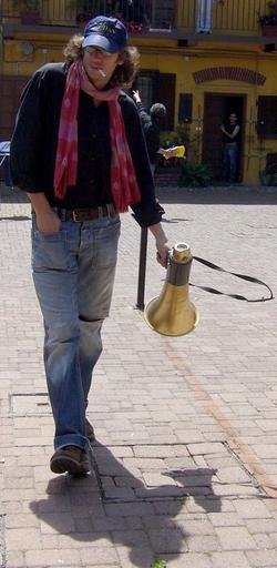 Keywords: GJSquarcia.jpg en Giorgio Squarcia in 2008 own Vision of johanna Willy Berni People with hand-held megaphones Right hand in pocket Males with baseball caps Men smiling while standing