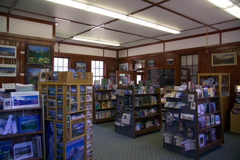 Keywords: glacier national park west apgar west glacier glaciernationalparkwestapgarwestglacier bookstore glacier association glacierassociation depot railroad indoor room bookshelf shelf stacks Photo: David Restivo, NPS Photo: David Restivo, NPS