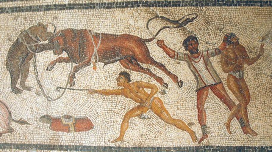Keywords: Gladiators face animals Zliten mosaic.JPG Gladiators fight animals in this scene from the Zliten mosaic http //www livius org/a/libya/zliten/dar_buc_ammera_gladiators_tripoli_mus06 JPG this site c AD 200 author PD-old Mosaics of gladiators from the Zliten mosaic Mosaics of bulls Bestiarii Mosaics of bears |
