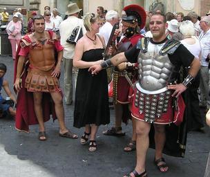 Keywords: Gladiators.pose.for.tourists.in.rome.arp.jpg Roman soldiers pose for photographs in Rome The tourist is expected to pay for the photograph I have no idea whether the costume is in any way authentic 2007-06-16 own assumed Arpingstone Author Photographed by Adrian Pingstone in June 2007 and placed in the public domain Roman legion reenactments Tourist photography |