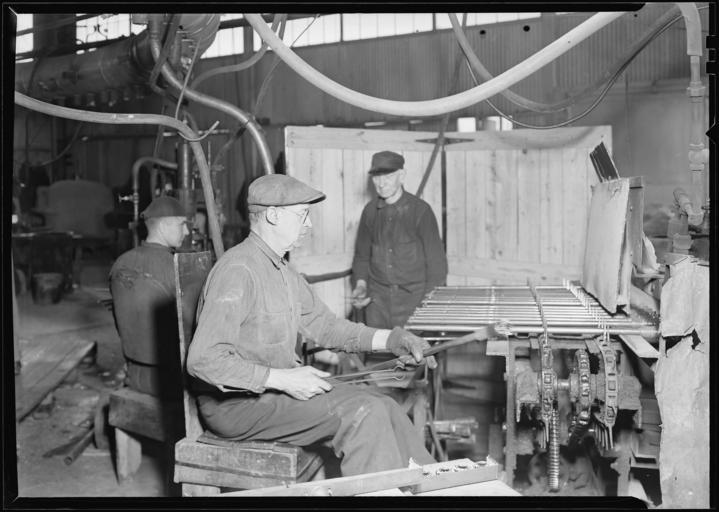 Keywords: nara:arcid=518638 u.s. national archives usnationalarchives lewis hine lewishine 1937 millville new jersey newjersey the great depression thegreatdepression blackandwhite monochrome black and white Original Caption: Millville, New Jersey - Glass bottles. T.C. Wheaton Co. A pressing shop finishing door knobs. Pressed door knobs are put on to rods seen in the center right of the picture and are rolled along on the machine in front fo gas flames, to be polished. They are taken off by the man in te center of the picture who twists the ends of the knobs to finish them, March 1937 U.S. National Archives’ Local Identifier: 69-RP-411 Photographer: Hine, Lewis Subjects: The New Deal Tennessee Valley Authority Works Progress Administration Work Portraits The Great Depression Persistent URL: research.archives.gov/description/518638 Repository: Still Picture Records Section, Special Media Archives Services Division (NWCS-S), National Archives at College Park, 8601 Adelphi Road, College Park, MD, 20740-6001. For information about ordering reproductions of photographs held by the Still Picture Unit, visit: www.archives.gov/research/order/still-pictures.html Reproductions may be ordered via an independent vendor. NARA maintains a list of vendors at www.archives.gov/research/order/vendors-photos-maps-dc.html Access Restrictions: Unrestricted Use Restrictions: Unrestricted Original Caption: Millville, New Jersey - Glass bottles. T.C. Wheaton Co. A pressing shop finishing door knobs. Pressed door knobs are put on to rods seen in the center right of the picture and are rolled along on the machine in front fo gas flames, to be polished. They are taken off by the man in te center of the picture who twists the ends of the knobs to finish them, March 1937 U.S. National Archives’ Local Identifier: 69-RP-411 Photographer: Hine, Lewis Subjects: The New Deal Tennessee Valley Authority Works Progress Administration Work Portraits The Great Depression Persistent URL: research.archives.gov/description/518638 Repository: Still Picture Records Section, Special Media Archives Services Division (NWCS-S), National Archives at College Park, 8601 Adelphi Road, College Park, MD, 20740-6001. For information about ordering reproductions of photographs held by the Still Picture Unit, visit: www.archives.gov/research/order/still-pictures.html Reproductions may be ordered via an independent vendor. NARA maintains a list of vendors at www.archives.gov/research/order/vendors-photos-maps-dc.html Access Restrictions: Unrestricted Use Restrictions: Unrestricted |
