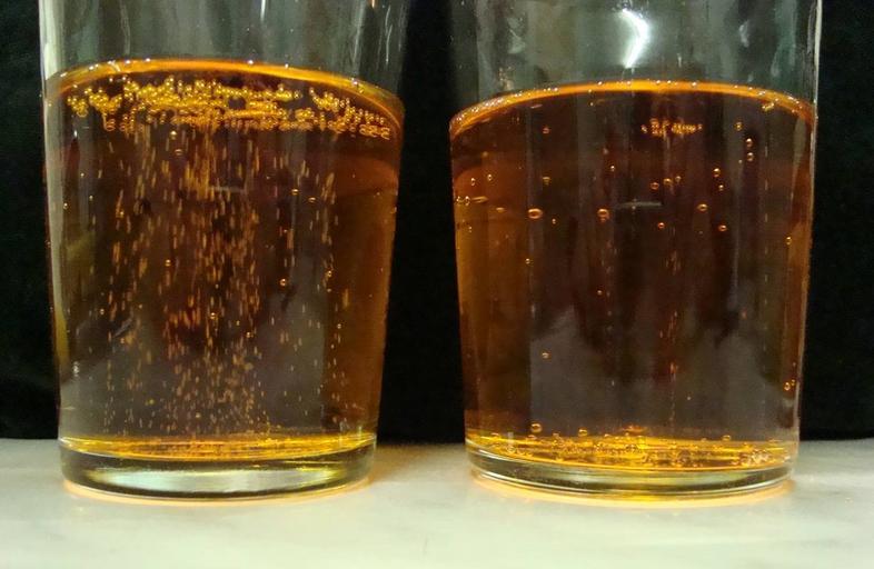 MAKE A MEME View Large Image Glass widget comparison.jpg en comparison of CO2 bubbles formed in a glass containing an etched widget in its base with a glass that does not Own BigSteve 2009-01 GFDL Beer glasses Bubbles