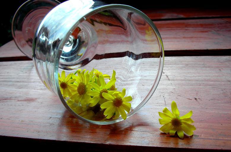 Keywords: glass wooden desk chamomile yellow flowers