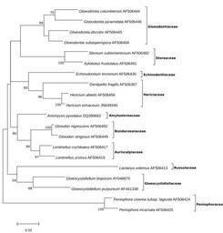 Keywords: Gloeodontia-Maximum Likelihood-Tree.svg Figure Molecular Phylogenetic analysis of Gloeodontia by the Maximum Likelihood method <br/> The evolutionary history was inferred by using the Maximum Likelihood method based on the Kimura 2-parameter model 1 The tree with the highest log likelihood -5982 7851 is shown The percentage of trees in which the associated taxa clustered together is shown next to the branches only if over 50 Initial tree for the heuristic search were obtained by applying the Neighbor-Joining method to a matrix of pairwise distances estimated using the Maximum Composite Likelihood MCL approach A discrete Gamma distribution was used to model evolutionary rate differences among sites 5 categories +G parameter 0 5405 The rate variation model allowed for some sites to be evolutionarily invariable +I 60 1162 sites The tree is drawn to scale with branch lengths measured in the number of substitutions per site The analysis involved 20 nucleotide sequences All positions with less than 95 site coverage were eliminated That is fewer than 5 alignment gaps missing data and ambiguous bases were allowed at any position There were a total of 1461 positions in the final dataset Evolutionary analyses were conducted in http //megasoftware net/ MEGA6 2 <br/> 1 Kimura M 1980 A simple method for estimating evolutionary rate of base substitutions through comparative studies of nucleotide sequences Journal of Molecular Evolution 16 111-120 <br/> 2 Tamura K Stecher G Peterson D Filipski A and Kumar S 2013 MEGA6 Molecular Evolutionary Genetics Analysis version 6 0 Molecular Biology and Evolution30 2725-2729 <br/> ; List with GenBank Sequences which were used for the ML-Tree http //www ncbi nlm nih gov/nuccore/DQ389662 Artomyces pyxidatus DQ389662 http //www ncbi nlm nih gov/nuccore/AF506387 Dentipellis fragilis AF506387 http //www ncbi nlm nih gov/nuccore/AF506430 Echinodontium tinctorium AF506430 http //www ncbi nlm nih gov/nuccore/AY048875 Gloeocystidiellum bisporum AY048875 http //www ncbi nlm nih gov/nuccore/AF441338 Gloeocystidiellum purpureum AF441338 http //www ncbi nlm nih gov/nuccore/AF506444 Gloeodontia columbiensis AF506444 http //www ncbi nlm nih gov/nuccore/AF506445 Gloeodontia discolor AF506445 http //www ncbi nlm nih gov/nuccore/AF506446 Gloeodontia pyramidata AF506446 http //www ncbi nlm nih gov/nuccore/AF506404 Gloeodontia subasperispora AF506404 http //www ncbi nlm nih gov/nuccore/AF506450 Gloiodon nigrescens AF506450 http //www ncbi nlm nih gov/nuccore/AF506449 Gloiodon strigosus AF506449 http //www ncbi nlm nih gov/nuccore/AF506456 Hericium abietis AF506456 http //www ncbi nlm nih gov/nuccore/JN649345 Hericium erinaceum JN649345 http //www ncbi nlm nih gov/nuccore/AF506413 Lactarius volemus AF506413 http //www ncbi nlm nih gov/nuccore/AF506417 Lentinellus cochleatus AF506417 http //www ncbi nlm nih gov/nuccore/AF506419 Lentinellus ursinus AF506419 http //www ncbi nlm nih gov/nuccore/AF506424 Peniophora cinerea subsp fagicola AF506424 http //www ncbi nlm nih gov/nuccore/AF506425 Peniophora incarnata AF506425 http //www ncbi nlm nih gov/nuccore/AF506482 Stereum subtomentosum AF506482 http //www ncbi nlm nih gov/nuccore/AF506491 Xylobolus frustulatus AF506491 own 2014-08-22 Thkgk Cc-zero Gloeodontia Gloeodontia columbiensis Gloeodontia discolor Gloeodontia pyramidata Gloeodontia subasperispora |