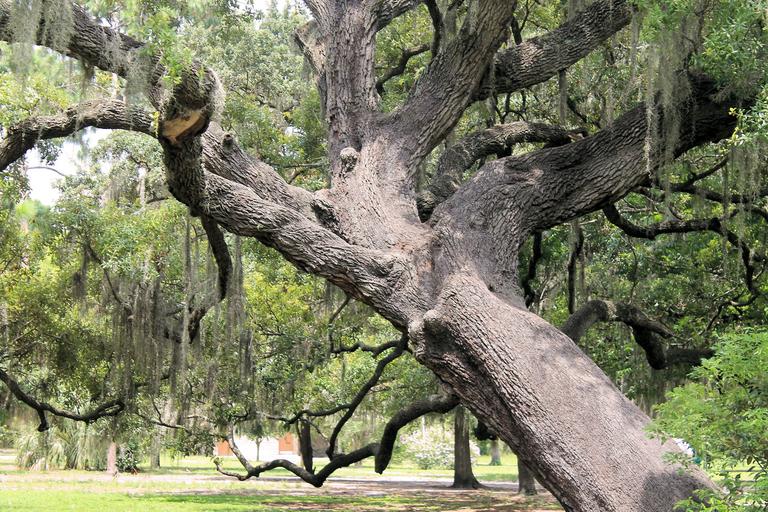Keywords: gnarly oak big tree old tree tree park mossy tree oak leaning tree climbing tree trunk bark moss nature