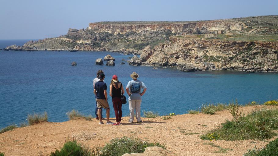 Keywords: gnejna bay rocks cliffs malta coast tourists sea limestone wild flowers water blue mediterranean summer scenic maltese tourism island
