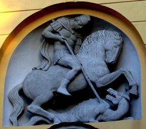 Keywords: Gniezno.St George Church.Detail.JPG Rzeźba patrona na fasadzie kościoła św Jerzego w Gnieźnie Dzieło Marcina Rożka 1936 Own 2007-09-16 Łukasz Waligórski Saint George church in Gniezno