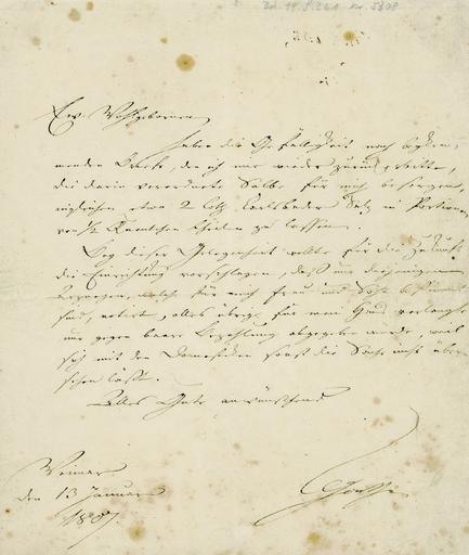 Keywords: Goethe Brief 1807-01-13 an Carl August Hofmann.jpg Brief Johann Wolfgang von Goethes mit Unterschrift Goethe Weimar 13 Januar 1807 an den Weimarer Hofapotheker Professor Carl August Hofmann; mit der Bitte nach beykommenden Briefe den ich mir wieder zurück erbitte die darin verordnete Salbe für mich besorgen ingleichen etwa 2 Loth Carlsbader Salz in Portionen von ½ Quentchen theilen zu lassen - Bey dieser Gelegenheit wollte für die Zukunft die Einrichtung vorschlagen daß nur diejenigen Arzneyen welche für mich Frau und Sohn bestimmt sind notirt alles übrige für mein Haus verlangte nur gegen baare Bezahlung abgegeben würde weil sich mit den Domestiken sonst die Sache nicht übersehen läßt Sophien-Ausgabe Nr 5308 Aus der Sammlung Hirzel http //www bassenge com Bassenge 1807-01-13 Creator Johann Wolfgang von Goethe PD-old-100 Images from Galerie Bassenge 1807 letters Autographs of Johann Wolfgang von Goethe |