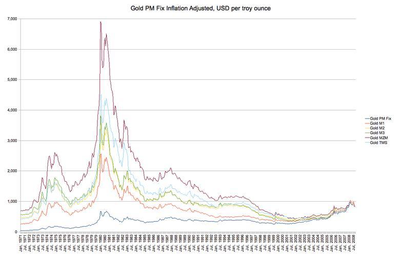 Keywords: Gold Inflation Adjusted.png Long file description pages with source data en Gold price adjusted by various inflation measures M1 M2 M3 MZM and TMS Based on World Gold Council http //www research gold org/prices/ Gold prices; Ludwig von Mises Institute http //mises org/content/nofed/chart aspx series TMS Money Supply Emilfaro 2008-12-03 117 height 17 align LEFT DATE 58 align LEFT M1 58 align LEFT M2 65 align LEFT M3 58 align LEFT MZM 58 align LEFT TMS 88 align LEFT Gold PM Fix 65 align LEFT Gold M1 65 align LEFT Gold M2 65 align LEFT Gold M3 76 align LEFT Gold MZM 74 align LEFT Gold TMS - 17 align RIGHT January 1971 RIGHT 220 4 RIGHT 635 5 RIGHT 688 4 RIGHT 482 1 RIGHT 492 9 RIGHT 37 88 RIGHT 251 84 RIGHT 468 20 RIGHT 565 45 RIGHT 683 32 RIGHT 423 50 - 17 align RIGHT February 1971 RIGHT 214 3 RIGHT 638 0 RIGHT 692 7 RIGHT 479 4 RIGHT 492 0 RIGHT 38 74 RIGHT 264 89 RIGHT 476 95 RIGHT 574 70 RIGHT 702 77 RIGHT 433 90 - 17 align RIGHT March 1971 RIGHT 216 4 RIGHT 650 0 RIGHT 706 3 RIGHT 486 9 RIGHT 496 4 RIGHT 38 87 RIGHT 263 20 RIGHT 469 72 RIGHT 565 53 RIGHT 694 26 RIGHT 431 50 - 17 align RIGHT April 1971 RIGHT 221 4 RIGHT 663 5 RIGHT 718 9 RIGHT 496 3 RIGHT 505 8 RIGHT 39 01 RIGHT 258 18 RIGHT 461 82 RIGHT 557 62 RIGHT 683 57 RIGHT 425 01 - 17 align RIGHT May 1971 RIGHT 218 8 RIGHT 666 1 RIGHT 722 7 RIGHT 496 2 RIGHT 508 2 RIGHT 40 52 RIGHT 271 36 RIGHT 477 82 RIGHT 576 16 RIGHT 710 17 RIGHT 439 37 - 17 align RIGHT June 1971 RIGHT 222 9 RIGHT 675 9 RIGHT 732 1 RIGHT 503 7 RIGHT 513 0 RIGHT 40 10 RIGHT 263 61 RIGHT 466 01 RIGHT 562 86 RIGHT 692 34 RIGHT 430 75 - 17 align RIGHT July 1971 RIGHT 225 1 RIGHT 682 3 RIGHT 739 8 RIGHT 507 8 RIGHT 518 6 RIGHT 40 95 RIGHT 266 57 RIGHT 471 43 RIGHT 568 81 RIGHT 701 31 RIGHT 435 13 - 17 align RIGHT August 1971 RIGHT 223 6 RIGHT 683 7 RIGHT 743 1 RIGHT 506 9 RIGHT 517 9 RIGHT 42 71 RIGHT 279 89 RIGHT 490 68 RIGHT 590 62 RIGHT 732 75 RIGHT 454 45 - 17 align RIGHT September 1971 RIGHT 225 4 RIGHT 689 7 RIGHT 750 0 RIGHT 510 2 RIGHT 521 8 RIGHT 42 03 RIGHT 273 23 RIGHT 478 67 RIGHT 575 87 RIGHT 716 42 RIGHT 443 87 - 17 align RIGHT October 1971 RIGHT 226 6 RIGHT 695 6 RIGHT 758 3 RIGHT 513 9 RIGHT 523 1 RIGHT 42 50 RIGHT 274 82 RIGHT 479 92 RIGHT 575 94 RIGHT 719 22 RIGHT 447 72 - 17 align RIGHT November 1971 RIGHT 228 8 RIGHT 701 2 RIGHT 764 9 RIGHT 516 5 RIGHT 524 7 RIGHT 42 86 RIGHT 274 49 RIGHT 480 12 RIGHT 575 81 RIGHT 721 66 RIGHT 450 13 - 17 align RIGHT December 1971 RIGHT 234 5 RIGHT 711 2 RIGHT 776 6 RIGHT 524 4 RIGHT 535 2 RIGHT 43 48 RIGHT 271 69 RIGHT 480 21 RIGHT 575 33 RIGHT 721 07 RIGHT 447 68 - 17 align RIGHT January 1972 RIGHT 235 0 RIGHT 720 0 RIGHT 786 1 RIGHT 527 5 RIGHT 539 0 RIGHT 45 75 RIGHT 285 27 RIGHT 499 11 RIGHT 598 06 RIGHT 754 25 RIGHT 467 74 - 17 align RIGHT February 1972 RIGHT 228 9 RIGHT 722 2 RIGHT 789 2 RIGHT 524 6 RIGHT 536 0 RIGHT 48 26 RIGHT 308 94 RIGHT 524 89 RIGHT 628 39 RIGHT 800 03 RIGHT 496 16 - 17 align RIGHT March 1972 RIGHT 231 7 RIGHT 733 7 RIGHT 800 5 RIGHT 532 3 RIGHT 544 3 RIGHT 48 33 RIGHT 305 65 RIGHT 517 41 RIGHT 620 42 RIGHT 789 60 RIGHT 489 30 - 17 align RIGHT April 1972 RIGHT 236 9 RIGHT 743 8 RIGHT 813 2 RIGHT 540 5 RIGHT 552 3 RIGHT 49 03 RIGHT 303 27 RIGHT 517 77 RIGHT 619 57 RIGHT 788 89 RIGHT 489 20 - 17 align RIGHT May 1972 RIGHT 232 2 RIGHT 742 6 RIGHT 815 4 RIGHT 536 8 RIGHT 551 4 RIGHT 54 62 RIGHT 344 68 RIGHT 577 74 RIGHT 688 35 RIGHT 884 89 RIGHT 545 86 - 17 align RIGHT June 1972 RIGHT 236 1 RIGHT 753 2 RIGHT 827 0 RIGHT 544 2 RIGHT 555 1 RIGHT 62 09 RIGHT 385 35 RIGHT 647 51 RIGHT 771 52 RIGHT 992 23 RIGHT 616 38 - 17 align RIGHT July 1972 RIGHT 239 1 RIGHT 763 0 RIGHT 837 8 RIGHT 549 4 RIGHT 560 9 RIGHT 65 66 RIGHT 402 39 RIGHT 675 95 RIGHT 805 36 RIGHT 1 039 35 RIGHT 645 08 - 17 align RIGHT August 1972 RIGHT 238 7 RIGHT 767 0 RIGHT 846 1 RIGHT 550 0 RIGHT 559 4 RIGHT 67 03 RIGHT 411 47 RIGHT 686 45 RIGHT 814 10 RIGHT 1 059 88 RIGHT 660 31 - 17 align RIGHT September 1972 RIGHT 241 9 RIGHT 775 2 RIGHT 854 8 RIGHT 554 8 RIGHT 565 0 RIGHT 65 46 RIGHT 396 52 RIGHT 663 28 RIGHT 786 94 RIGHT 1 026 10 RIGHT 638 45 - 17 align RIGHT October 1972 RIGHT 244 2 RIGHT 783 6 RIGHT 863 6 RIGHT 559 7 RIGHT 571 0 RIGHT 64 86 RIGHT 389 19 RIGHT 650 16 RIGHT 771 78 RIGHT 1 007 79 RIGHT 625 95 - 17 align RIGHT November 1972 RIGHT 247 7 RIGHT 790 2 RIGHT 871 9 RIGHT 564 0 RIGHT 574 8 RIGHT 62 91 RIGHT 372 15 RIGHT 625 34 RIGHT 741 45 RIGHT 970 04 RIGHT 603 12 - 17 align RIGHT December 1972 RIGHT 256 1 RIGHT 803 1 RIGHT 886 2 RIGHT 574 8 RIGHT 587 3 RIGHT 63 91 RIGHT 365 67 RIGHT 625 08 RIGHT 741 08 RIGHT 966 94 RIGHT 599 66 - 17 align RIGHT January 1973 RIGHT 256 4 RIGHT 812 3 RIGHT 897 8 RIGHT 576 5 RIGHT 589 4 RIGHT 65 14 RIGHT 372 27 RIGHT 629 89 RIGHT 745 58 RIGHT 982 65 RIGHT 609 03 - 17 align RIGHT February 1973 RIGHT 248 4 RIGHT 810 1 RIGHT 901 7 RIGHT 569 6 RIGHT 584 3 RIGHT 74 20 RIGHT 437 70 RIGHT 719 45 RIGHT 845 61 RIGHT 1 132 88 RIGHT 699 79 - 17 align RIGHT March 1973 RIGHT 248 8 RIGHT 815 6 RIGHT 914 7 RIGHT 573 7 RIGHT 588 8 RIGHT 84 46 RIGHT 497 41 RIGHT 813 39 RIGHT 948 83 RIGHT 1 280 28 RIGHT 790 44 - 17 align RIGHT April 1973 RIGHT 254 0 RIGHT 825 4 RIGHT 927 8 RIGHT 580 7 RIGHT 593 8 RIGHT 90 51 RIGHT 522 14 RIGHT 861 32 RIGHT 1 002 46 RIGHT 1 355 47 RIGHT 839 95 - 17 align RIGHT May 1973 RIGHT 250 8 RIGHT 825 8 RIGHT 931 6 RIGHT 578 0 RIGHT 591 7 RIGHT 102 56 RIGHT 599 22 RIGHT 975 55 RIGHT 1 131 33 RIGHT 1 543 16 RIGHT 955 18 - 17 align RIGHT June 1973 RIGHT 256 4 RIGHT 837 2 RIGHT 943 5 RIGHT 586 4 RIGHT 598 6 RIGHT 120 20 RIGHT 686 91 RIGHT 1 127 71 RIGHT 1 309 12 RIGHT 1 782 57 RIGHT 1 106 51 - 17 align RIGHT July 1973 RIGHT 258 1 RIGHT 840 7 RIGHT 953 2 RIGHT 588 5 RIGHT 600 3 RIGHT 119 92 RIGHT 680 84 RIGHT 1 120 47 RIGHT 1 292 85 RIGHT 1 772 18 RIGHT 1 100 87 - 17 align RIGHT August 1973 RIGHT 255 6 RIGHT 837 4 RIGHT 959 5 RIGHT 581 9 RIGHT 591 2 RIGHT 106 58 RIGHT 611 02 RIGHT 999 75 RIGHT 1 141 49 RIGHT 1 592 91 RIGHT 993 47 - 17 align RIGHT September 1973 RIGHT 256 5
