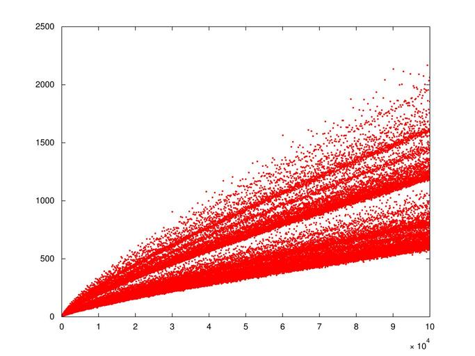 | Keywords: Goldbach-100000.svg en A graph showing the number of ways an even number can be written as the sum of two primes 4 < n < 100000 de Ein Graph zeigt die Zahl der Möglichkeiten wie eine gerade Zahl als Summe zweier Primzahlen geschrieben werden kann 4 < n < 100000 own Mucfish 2009-11-24 thumb n < 1000 thumb n < 10000 Goldbach's conjecture |