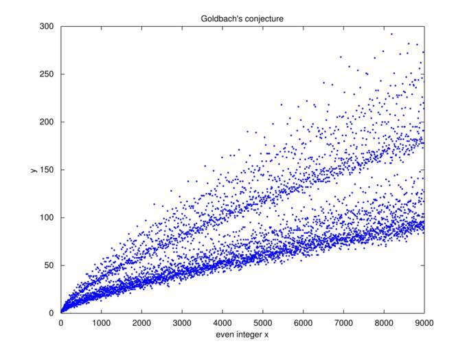 Keywords: Goldbach.svg en A graph showing the number of ways an even number can be written as the sum of two primes 4 < n < 9000 de Ein Graph zeigt die Zahl der Möglichkeiten wie eine gerade Zahl als Summe zweier Primzahlen geschrieben werden kann 4 < n < 9000 own Mucfish 2009-11-24 thumb n < 1000thumb n < 10000thumb n < 100000 Goldbach's conjecture |