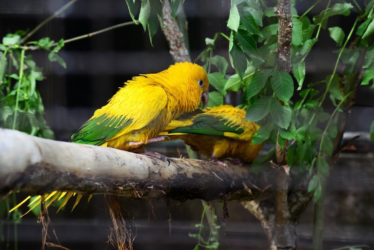 Keywords: golden conure parrots queen of bavaria conure pair birds yellow green brazil feathers close-up exotic tropical