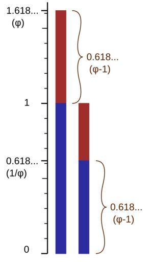 Keywords: Golden Ratio. Deriving equation.svg en Caption This image illustrates why 1/φ φ-1<br />Using the image on the right it can be visually appreciated although with difficulty that inverse of the golden ratio equals the golden ratio minus one or 1/φ φ-1 To see this mathematical relationship in the animation first imagine a vertical number line where the bottom of all the bars are at the number line ™s origin or point 0 Also imagine that the top of the first blue bar is at the point 1 on the number line That would make the top of the first red bar coincide with the point 1 618 which is the golden ratio Since the length of the first blue bar is 1 that makes the length of the first red bar equal to 0 618 or φ-1 which is the right hand side of the equation we are discussing 1/φ φ-1 Now first note that two numbers are multiplicative inverses if when they are multiplied together you get 1 In our instance this means φ 1/φ 1 and we want to show that 1/φ φ-1 It is a direct mathematical fact that if the top of the first blue bar is at the point 1 and the second composite bar has the same red to blue ratio as the first then the top of the second blue bar corresponds to the point on the number line that is the inverse of the point at the top of the first red bar This is a general fact and is not specific to the golden ratio however since the top of the first red bar is at φ 1 618 then the top of the second blue bar is at 1/φ And finally since the length of the second blue bar is equal to the length of the first red bar 1/φ φ-1 Golden Ratio Display Animation gif Golden Ratio Variation Animation gif Golden ratio |