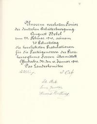 Keywords: Goldenes Buch zum 70. Geburtstag August Bebel 1910 Seite 039.jpg Goldenes Buch zum 70 Geburtstag August Bebel 1910 Seite_ jpg 038 040 Glückwunschschreiben zum 70 Geburtstag von August Bebel SPD-Landeskomitee Hessen August Bebel zum siebzigsten Geburtstag 22 Februar 1910 / mit einer Nachbemerkung von Ursula Herrmann Reprint des Unikats aus dem Zentralen Parteiarchiv der SED Dietz Verlag Berlin 1989 Lizenzausgabe Saur 1989 ISBN 3-598-07256-2 self scanned from own book 1910 Diverse Goldenes Buch zum 70 Geburtstag August Bebel 1910 PD-old-70-1923 |