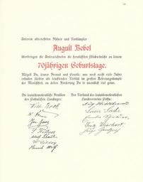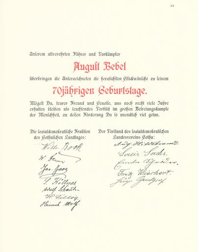 Keywords: Goldenes Buch zum 70. Geburtstag August Bebel 1910 Seite 044.jpg Goldenes Buch zum 70 Geburtstag August Bebel 1910 Seite_ jpg 043 045 Glückwunschschreiben zum 70 Geburtstag von August Bebel SPD Gotha August Bebel zum siebzigsten Geburtstag 22 Februar 1910 / mit einer Nachbemerkung von Ursula Herrmann Reprint des Unikats aus dem Zentralen Parteiarchiv der SED Dietz Verlag Berlin 1989 Lizenzausgabe Saur 1989 ISBN 3-598-07256-2 self scanned from own book 1910 Diverse Goldenes Buch zum 70 Geburtstag August Bebel 1910 PD-old-70-1923 |