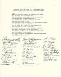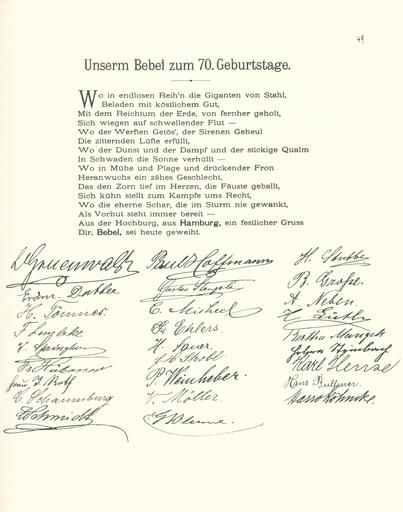 Keywords: Goldenes Buch zum 70. Geburtstag August Bebel 1910 Seite 049.jpg Goldenes Buch zum 70 Geburtstag August Bebel 1910 Seite_ jpg 048 050 Glückwunschschreiben zum 70 Geburtstag von August Bebel SPD-Landesorganisation Hamburg August Bebel zum siebzigsten Geburtstag 22 Februar 1910 / mit einer Nachbemerkung von Ursula Herrmann Reprint des Unikats aus dem Zentralen Parteiarchiv der SED Dietz Verlag Berlin 1989 Lizenzausgabe Saur 1989 ISBN 3-598-07256-2 self scanned from own book 1910 Diverse Goldenes Buch zum 70 Geburtstag August Bebel 1910 PD-old-70-1923 |