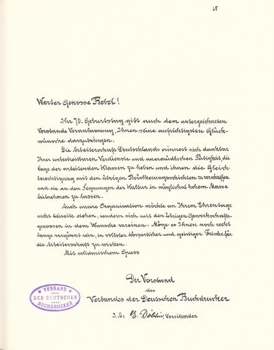 Keywords: Goldenes Buch zum 70. Geburtstag August Bebel 1910 Seite 065.jpg Goldenes Buch zum 70 Geburtstag August Bebel 1910 Seite_ jpg 064 066 Glückwunschschreiben zum 70 Geburtstag von August Bebel Vorstand des Verbandes der Deutschen Buchdrucker August Bebel zum siebzigsten Geburtstag 22 Februar 1910 / mit einer Nachbemerkung von Ursula Herrmann Reprint des Unikats aus dem Zentralen Parteiarchiv der SED Dietz Verlag Berlin 1989 Lizenzausgabe Saur 1989 ISBN 3-598-07256-2 self scanned from own book 1910 Diverse Goldenes Buch zum 70 Geburtstag August Bebel 1910 PD-old-70-1923 |