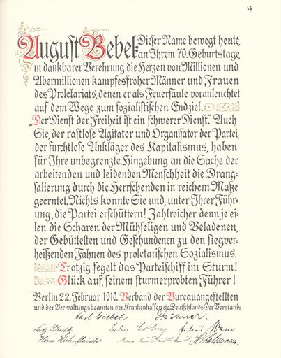 Keywords: Goldenes Buch zum 70. Geburtstag August Bebel 1910 Seite 067.jpg Goldenes Buch zum 70 Geburtstag August Bebel 1910 Seite_ jpg 066 068 Glückwunschschreiben zum 70 Geburtstag von August Bebel Vorstand des Verbandes der Bureauangestellten und der Verwaltungsbeamten der Krankenkassen Deutschlands August Bebel zum siebzigsten Geburtstag 22 Februar 1910 / mit einer Nachbemerkung von Ursula Herrmann Reprint des Unikats aus dem Zentralen Parteiarchiv der SED Dietz Verlag Berlin 1989 Lizenzausgabe Saur 1989 ISBN 3-598-07256-2 self scanned from own book 1910 Diverse Goldenes Buch zum 70 Geburtstag August Bebel 1910 PD-old-70-1923 |