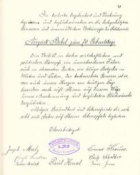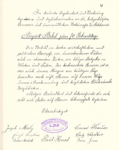 Keywords: Goldenes Buch zum 70. Geburtstag August Bebel 1910 Seite 070.jpg Goldenes Buch zum 70 Geburtstag August Bebel 1910 Seite_ jpg 069 071 Glückwunschschreiben zum 70 Geburtstag von August Bebel Haupt-Vorstand des Zentral-Verbandes der Fleischer und Berufsgenossen Deutschlands August Bebel zum siebzigsten Geburtstag 22 Februar 1910 / mit einer Nachbemerkung von Ursula Herrmann Reprint des Unikats aus dem Zentralen Parteiarchiv der SED Dietz Verlag Berlin 1989 Lizenzausgabe Saur 1989 ISBN 3-598-07256-2 self scanned from own book 1910 Diverse Goldenes Buch zum 70 Geburtstag August Bebel 1910 PD-old-70-1923 |