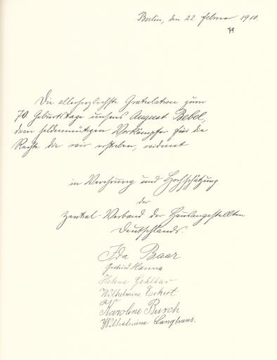 Keywords: Goldenes Buch zum 70. Geburtstag August Bebel 1910 Seite 079.jpg Goldenes Buch zum 70 Geburtstag August Bebel 1910 Seite_ jpg 078 080 Glückwunschschreiben zum 70 Geburtstag von August Bebel Zentralverband der Hausangestellten Deutschlands August Bebel zum siebzigsten Geburtstag 22 Februar 1910 / mit einer Nachbemerkung von Ursula Herrmann Reprint des Unikats aus dem Zentralen Parteiarchiv der SED Dietz Verlag Berlin 1989 Lizenzausgabe Saur 1989 ISBN 3-598-07256-2 self scanned from own book 1910 Diverse PD-old-70-1923 Goldenes Buch zum 70 Geburtstag August Bebel 1910 |