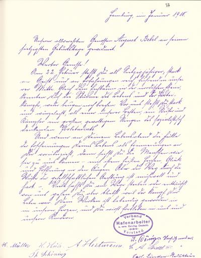 Keywords: Goldenes Buch zum 70. Geburtstag August Bebel 1910 Seite 077.jpg Goldenes Buch zum 70 Geburtstag August Bebel 1910 Seite_ jpg 076 078 Glückwunschschreiben zum 70 Geburtstag von August Bebel Vorstand des Verbandes der Hafenarbeiter und verwandter Berufsgenossen Deutschlands August Bebel zum siebzigsten Geburtstag 22 Februar 1910 / mit einer Nachbemerkung von Ursula Herrmann Reprint des Unikats aus dem Zentralen Parteiarchiv der SED Dietz Verlag Berlin 1989 Lizenzausgabe Saur 1989 ISBN 3-598-07256-2 self scanned from own book 1910 Diverse PD-old-70-1923 Goldenes Buch zum 70 Geburtstag August Bebel 1910 |