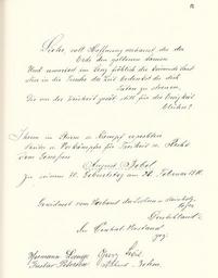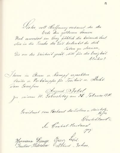 Keywords: Goldenes Buch zum 70. Geburtstag August Bebel 1910 Seite 082.jpg Goldenes Buch zum 70 Geburtstag August Bebel 1910 Seite_ jpg 081 083 Glückwunschschreiben zum 70 Geburtstag von August Bebel Central-Vorstand des Verbandes der Isolierer und Steinholzleger Deutschlands August Bebel zum siebzigsten Geburtstag 22 Februar 1910 / mit einer Nachbemerkung von Ursula Herrmann Reprint des Unikats aus dem Zentralen Parteiarchiv der SED Dietz Verlag Berlin 1989 Lizenzausgabe Saur 1989 ISBN 3-598-07256-2 self scanned from own book 1910 Diverse PD-old-70-1923 Goldenes Buch zum 70 Geburtstag August Bebel 1910 |