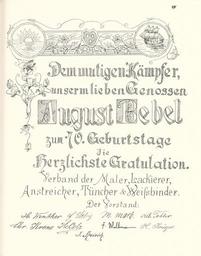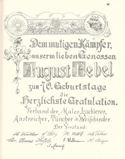Keywords: Goldenes Buch zum 70. Geburtstag August Bebel 1910 Seite 090.jpg Goldenes Buch zum 70 Geburtstag August Bebel 1910 Seite_ jpg 089 091 Glückwunschschreiben zum 70 Geburtstag von August Bebel Vorstand des Verbandes der Maler Lackiere Anstreicher Tüncher und Weissbinder August Bebel zum siebzigsten Geburtstag 22 Februar 1910 / mit einer Nachbemerkung von Ursula Herrmann Reprint des Unikats aus dem Zentralen Parteiarchiv der SED Dietz Verlag Berlin 1989 Lizenzausgabe Saur 1989 ISBN 3-598-07256-2 self scanned from own book 1910 Diverse PD-old-70-1923 Goldenes Buch zum 70 Geburtstag August Bebel 1910 |