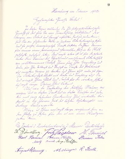 Keywords: Goldenes Buch zum 70. Geburtstag August Bebel 1910 Seite 091.jpg Goldenes Buch zum 70 Geburtstag August Bebel 1910 Seite_ jpg 090 092 Glückwunschschreiben zum 70 Geburtstag von August Bebel Vorstand des Zentralverbandes der Maurer Deutschlands August Bebel zum siebzigsten Geburtstag 22 Februar 1910 / mit einer Nachbemerkung von Ursula Herrmann Reprint des Unikats aus dem Zentralen Parteiarchiv der SED Dietz Verlag Berlin 1989 Lizenzausgabe Saur 1989 ISBN 3-598-07256-2 self scanned from own book 1910 Diverse PD-old-70-1923 Goldenes Buch zum 70 Geburtstag August Bebel 1910 |
