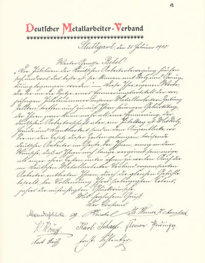 Keywords: Goldenes Buch zum 70. Geburtstag August Bebel 1910 Seite 092.jpg Goldenes Buch zum 70 Geburtstag August Bebel 1910 Seite_ jpg 091 093 Glückwunschschreiben zum 70 Geburtstag von August Bebel Vorstand des Deutschen Metallarbeiter-Verbandes August Bebel zum siebzigsten Geburtstag 22 Februar 1910 / mit einer Nachbemerkung von Ursula Herrmann Reprint des Unikats aus dem Zentralen Parteiarchiv der SED Dietz Verlag Berlin 1989 Lizenzausgabe Saur 1989 ISBN 3-598-07256-2 self scanned from own book 1910 Diverse PD-old-70-1923 Goldenes Buch zum 70 Geburtstag August Bebel 1910 |