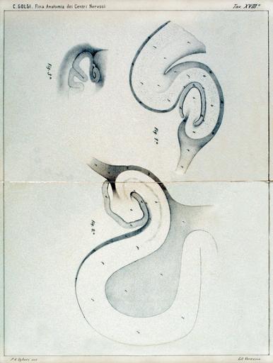 | Keywords: Golgi 1885 Plate XVIII.JPG en Plate XVIII Transverse-vertical sections through the human calf and dog pes Hippocampi major Golgi C Sulla fina anatomia degli organi centrali del sistema nervoso Reggio-Emilia S Calderini e Figlio; 1885 Reprinted in On the fine structure of the pes Hippocampi major with plates XIII “XXIII Brain Research Bulletin Vol 54 No 5 p 478 2001 Camillo Golgi 1885 public domain due to its age Camillo Golgi PD-old | ||||