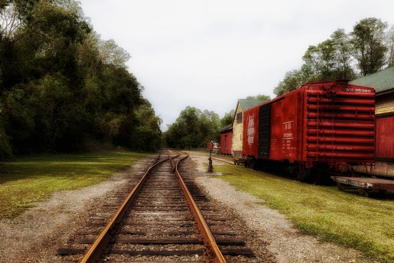 Keywords: goodspeed connecticut boxcars railroad railway trains trees tracks transportation travel sky hdr