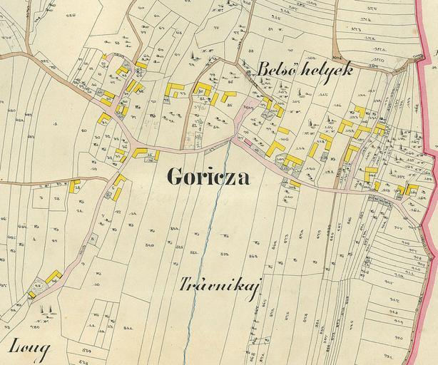 | Keywords: Gorica 1859 večji obseg in original.jpg Zemljevid Gorice 1859 Slovenija <br>Tako je izgledala Gorica pred 150 leti leto 2009 davnega leta 1859 bila je večinoma obdana z gozdom Slika je skenirana in ni cela - je samo izrez kjer so hiše Poslana mi je iz Geodetskega zavoda RS Legenda Njive Travniki Pašniki Listnate krošnje dreves pa nakazujejo redko poraslost z drevjem listavcev Stavba rdeče barve je bila edina v vasi zidana Ostale so bile lesene oddebeljena črta fasade pa naznačuje vhodno oz glavno stran poslopja Za oznako gozdov so povzeli staro srednjeveško klasifikacijo gozda na nizki srednji in visoki gozd zato so oznake gozda tudi MW Mittelwald ali HW Hochwald Ker legende ni si boste morali označen zemljevid razlagati po svoje Na moje vprašanje o legendi tega zemljevida pa sem dobil v Arhivu republike Slovenije naslednji odgovor Če pravilno razumem vaša vprašanja vas zanimajo legende na gradivu ki ga v Arhivu RS sploh nimamo zato bi bila razlaga zgolj ugibanje in morda celo strokovno sporno ravnanje V iskanju po internetu pa sem naletel na http //www posselt-landkarten de/zeichenerklaerung htm naslednjo stran ki je pa menda le podobna Fotografija skenirana in naložena Franc Lanjšček Zemljevid Gorice iz leta 1859 z hišami in njihovimi lastniki hišnimi številkami in parcelami - glej priloženi zemljevid wikitable Hišna številka Parcelna številka Lastnik hiše in parcele iz leta 1859 - 1 162 Bozsek Tresi - 2 159 Mörets Istvan - 3 150 Luthar Ferenez - 4 141 Luthar Ferenez - 5 145 Gutjmann Ignatz - 6 127 Mörets Josef - 7 122 Szeplits Mihael - 8 118 Verem Mathias - 9 113 Zseblek Miklos - 10 106 Kihar Janos - 11 101 Siftar Mihael - 12 93 Möretz Janosnö - 13 85 Katuna Janos - 14 80 Szecko Ivan - 15 73 Horvath Ivan - 16 38 Banfy Mihalynö - 17 39 Banfy Janos - 18 65 Slavits Mihalynö - 19 48 Gortsan Matyas - 20 41 Bürgemeister Leopold - 21 43 Domainko Lorencz - 22 31 Czelak Matyas - 23 15 Czelecz Janos - 24 26 Czelecz Janos - 25 5 Franko Matyas - 26 18 Mörecz Josef - 27 432 Kironos Istvan - 28 22 Občina Gorica - 29 35 Klobasa Lorentz - 30 97 Dietrich Leonard - 31 108 Vache Josef - 32 128 Verem Mathias - 33 50 Peschina Josef Uporaba tal na Gorici leta 1859 wikitable Vrsta Joch Klafter - Njive 358 136 - Travniki 123 804 - Vrtovi - 1263 - Sadovnjaki 4 681 - Pašniki 6 1184 - Visoki gozd - listavci 11 397 - Nizki gozd 15 1535 - Neuporabna tla 4 1033 - Reke in potoki 1 880 - Poti in krajevni prostor 8 147 - Zgradbe dvorišča in gradbišča 3 734 - Celotna površina 628 773 - 1 Joch 1600 kvadratnih klafter 5754 m² 0 575 ha 1 kvadratna klaftra 3 60 m² 1 a Ar 100 m² 10 m X 10 m 1 ha Hektar 100 a 10 000 m² 100 m X 100 m Zapisano je da je Gorica dobila ime po »goricah« - vinogradih Za ta čas to ne drži saj kot je razvidno iz »Uporabe tal« teh sploh ni PD-old Gorica Puconci 19th-century maps of Slovenia |